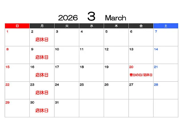 □3月の店休日:2日(月)、9日(月)、16日(月)、20日(金)、23日(月)、30日(月)