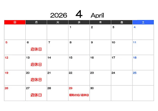 □4月の店休日:6日(月)、13日(月)、20日(月)、27日(月)、29日(水)